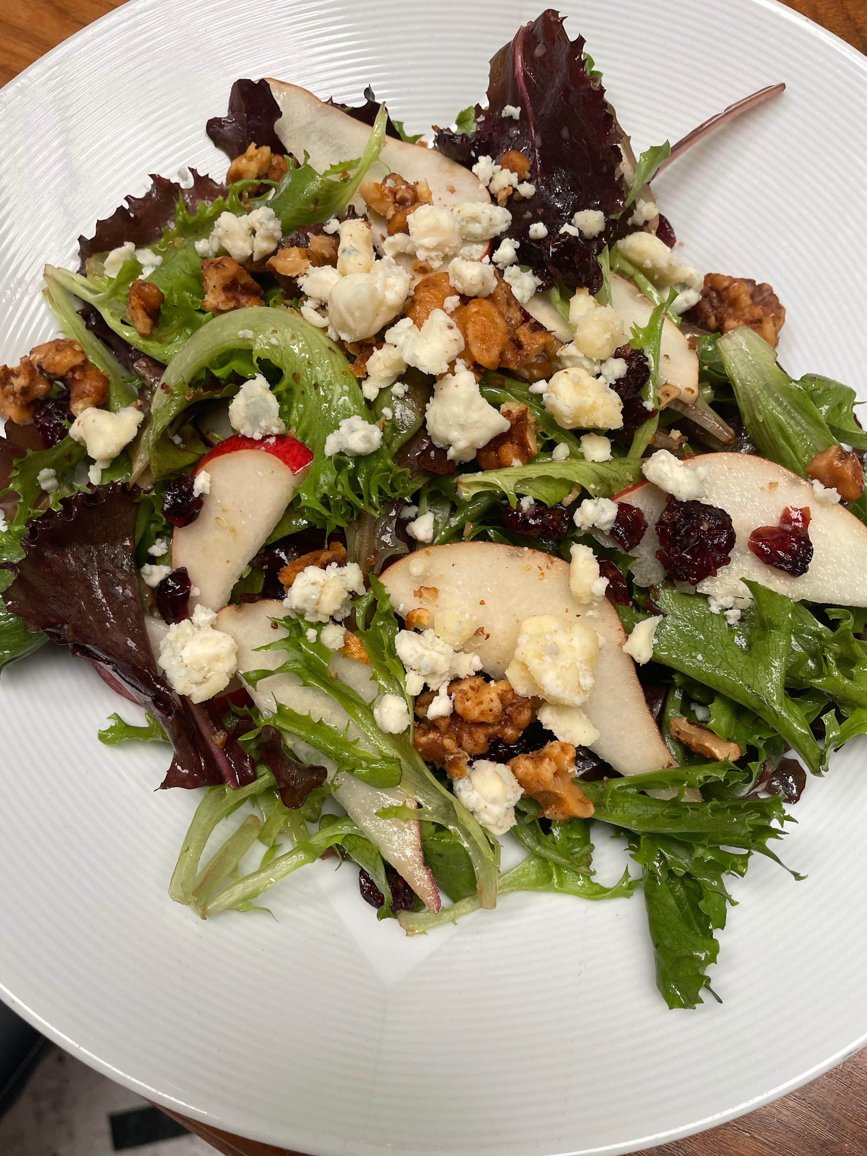 with Garden Lettuces, Local Pears, Point Reyes Blue Cheese, Candied Walnuts, Sun-dried Cranberries, Cider-Mustard Vinaigrette
