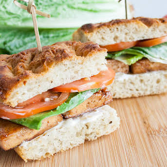 with Della Fattoria Focaccia, Roasted Pepper Relish, Provolone, Romaine and Basil Aioli